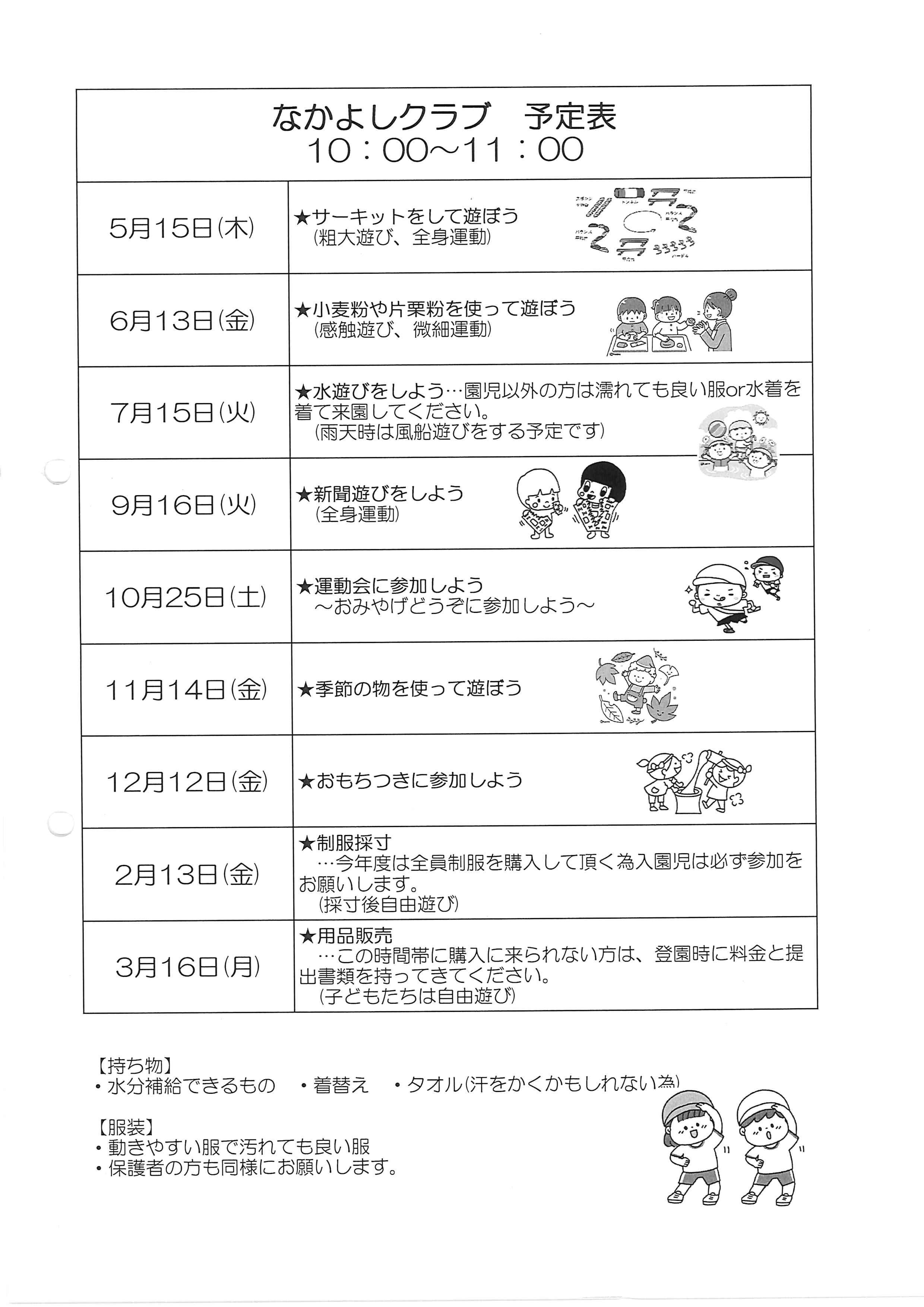 | 持ち物 | お着替え服上下 ひも付きおてふきタオル 水筒 歯磨きセット ※おむつ ※おしりふき (※必要な場合) |